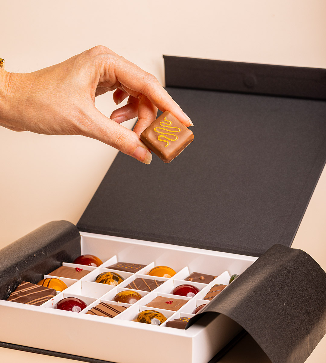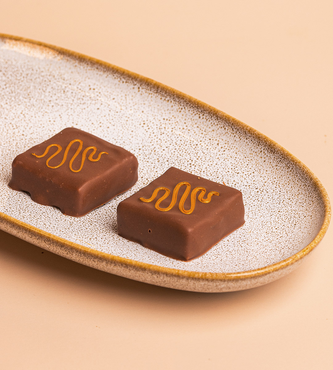 Um contraste delicioso entre frescura e crocância. Estes bombons combinam o toque cítrico do limão com o praliné de amêndoa, envoltos em chocolate delicado. Cada mordida é uma experiência equilibrada e elegante, perfeita para quem aprecia sabores originais e refinados.
