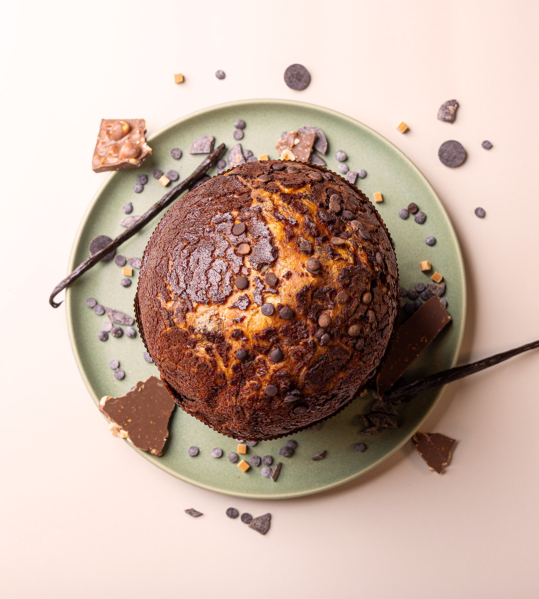 Este panettone combina massa macia e leve com três tipos de chocolate.